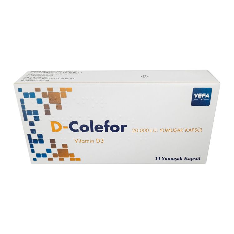 D-Colefor упакован в картонную коробку, которая содержит блистер с 14 мягкими капсулами. На упаковке указаны название препарата, дозировка (20000 МЕ), форма выпуска (мягкие капсулы) и количество капсул в упаковке (14 штук).