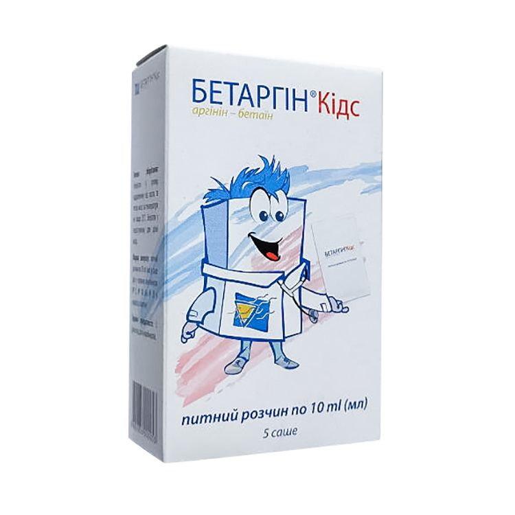 Бетаргин Кидс рекомендуется как дополнительный источник аргинина и бетаина детям в возрасте от 3 лет с целью нормализации функционального состояния пищеварительной системы, при ацетонемическом синдроме, для предотвращения интоксикации и устранения его последствий; способствует нормализации обмена липидов, улучшению физико-химических свойств желчи при ее сгущении и застойных явлениях.