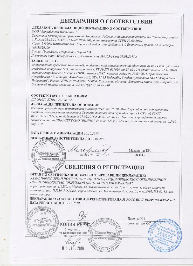 Прежде чем купить Брилинта в ближайшей аптеке, нужно обязательно проконсультироваться с врачом. Самолечение опасно для Вашего здоровья.