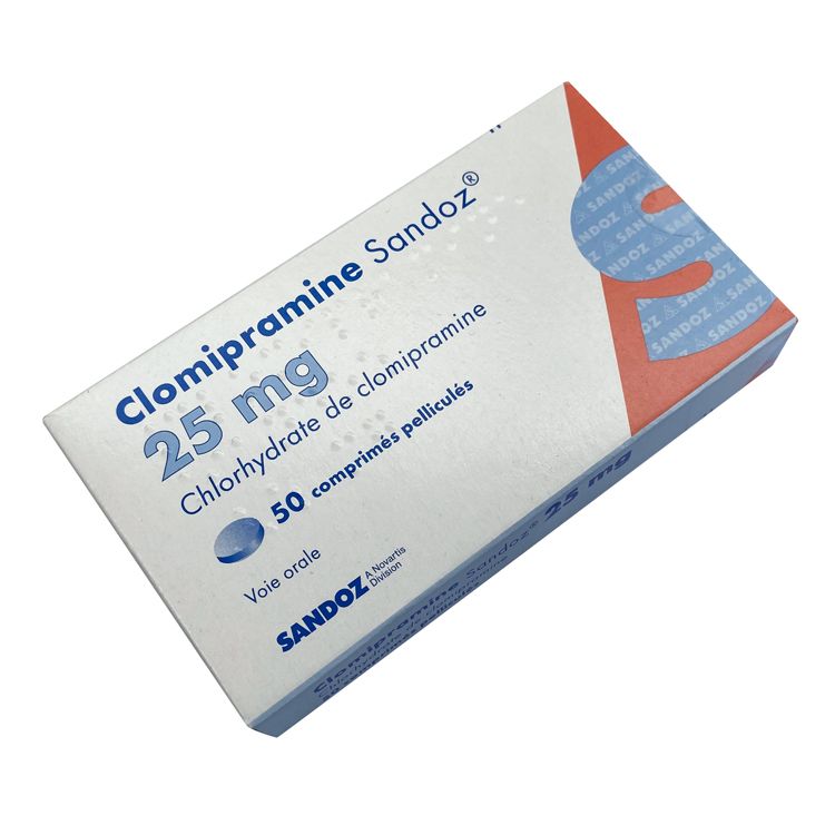 Препарат упакован в картонную коробку, которая содержит 50 таблеток, разделённых по блистерам. На упаковке указаны следующие данные: название препарата «Clomipramine Sandoz 25 mg», активное вещество (хлоргидрат кломипрамина), информация о дозировке, количестве таблеток и способе применения. Упаковка выполнена в бело-синем цветовом оформлении с оранжевыми элементами, на ней также указаны логотип производителя и инструкция по применению.