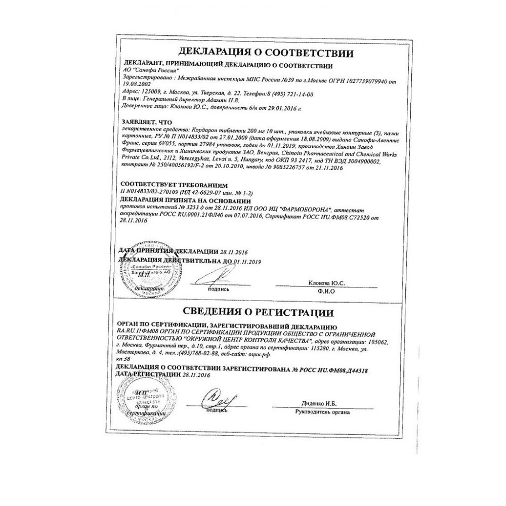 Прежде чем купить Кордарон таблетки в ближайшей аптеке, нужно обязательно проконсультироваться с врачом. Самолечение опасно для Вашего здоровья.