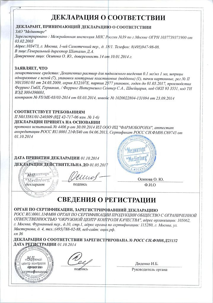 Прежде чем купить Декапептил в ближайшей аптеке, нужно обязательно проконсультироваться с врачом. Самолечение опасно для Вашего здоровья.