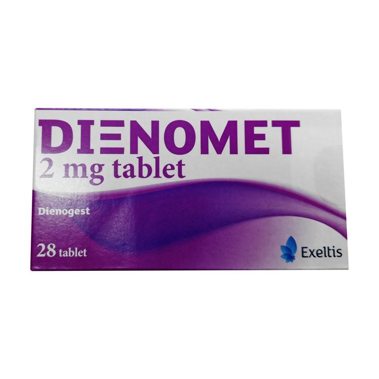 Медикамент упакован в картонную коробку, содержащую блистер с 28 таблетками. Внешний вид упаковки характеризуется строгим и современным дизайном с использованием фиолетового и белого цветов. На лицевой стороне упаковки указано название препарата "DIENOMET", дозировка – "2 мг", форма – "таблетка", количество таблеток – "28", а также название активного вещества – "Диеногест". В правом нижнем углу упаковки размещен логотип производителя – "Exeltis".