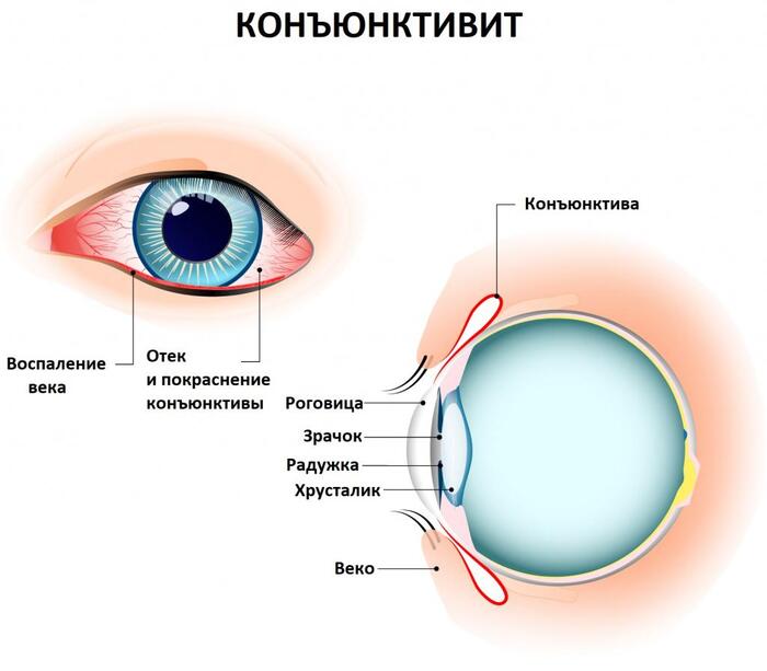 Развитие конъюнктивита – сложный процесс, в который вовлечена сама слизистая и кровеносные сосуды. Бактерии, вирусы, любое инородное тело, попадающее в глаз, взывает реакцию со стороны сосудов и крови. В очаг воспаления направляются иммунные клетки (нейтрофилы или лимфоциты в зависимости от возбудителя), чтобы нейтрализовать опасность. Сосуды, в свою очередь, становятся более проницаемыми, увеличивается их диаметр, что и обуславливает покраснение слизистой. Если причина конъюнктивита не вирусная и бактериальная, а аллергическая, для его развития нужен повторный контакт слизистой с аллергеном раздражающего действия.
