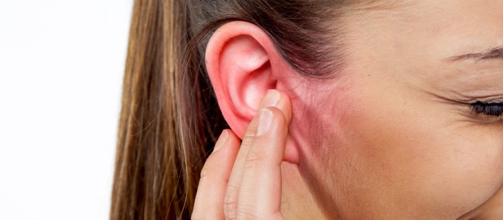 Клиническая картина зависит от распространения и размещения воспалительных процессов. Отит наружного уха манифестирует с умеренного покраснения кожного покрова. Диагностируют покраснение в области ушной раковины. Болезненные ощущения будут отдавать в челюсть, кончик носа или висок. Сильно это будет проявляться при активных действиях – пережёвывании, разговорах.