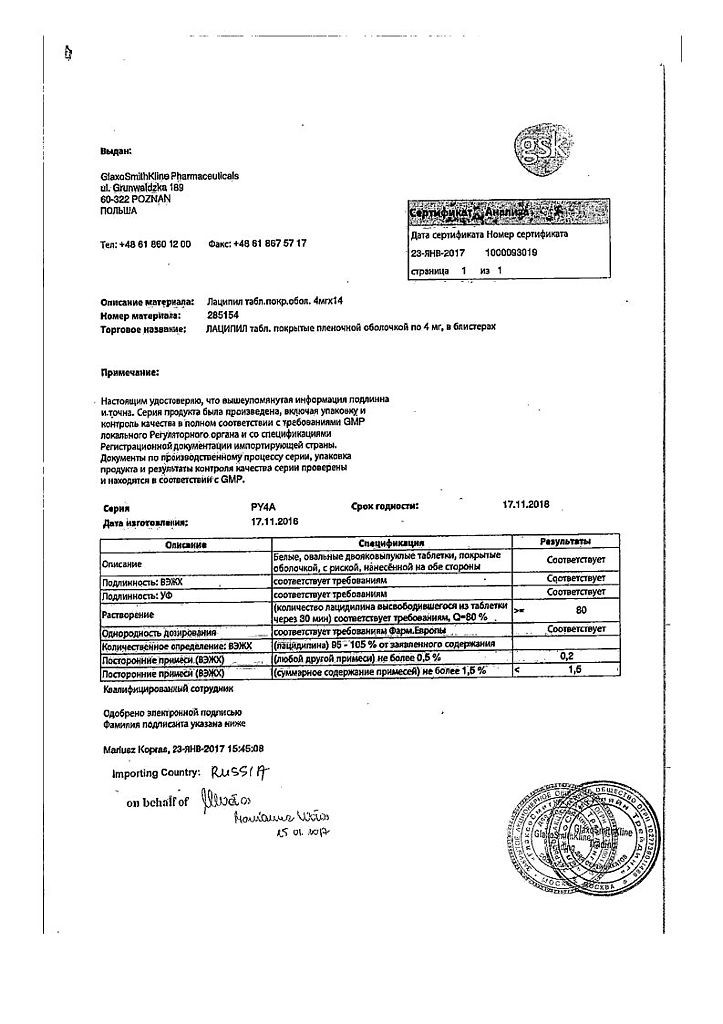 В сочетании с кортикостероидами, возможно, снижает действие гипотензивного препарата Лаципила.