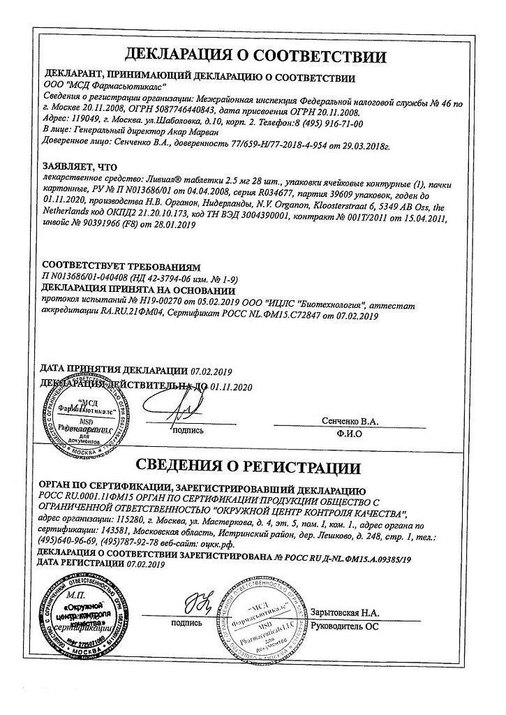 Решение о назначении Ливиала должно приниматься индивидуально для каждой женщины с учетом общего риска, и, особенно у пациентов старше 60 лет, следует учитывать риск инсульта.