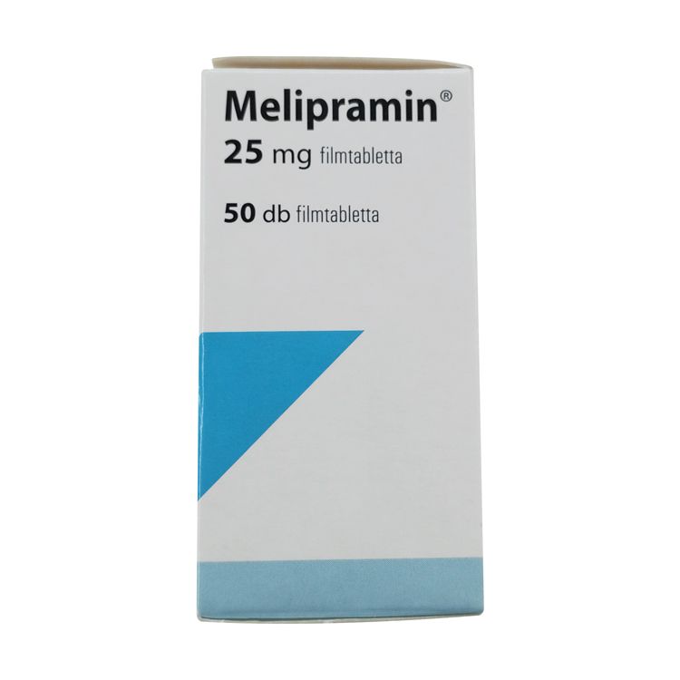 Препарат упакован в картонную коробку, выполненную в белом цвете с синими элементами дизайна. На лицевой стороне упаковки крупно указано название препарата "Melipramin", дозировка 25 мг и количество таблеток — 50 штук. Также присутствует информация о действующем веществе (имипрамин гидрохлорид) и логотип производителя — компании "EGIS". Упаковка защищена от вскрытия и маркирована согласно стандартам, обеспечивая необходимую информацию для потребителя.