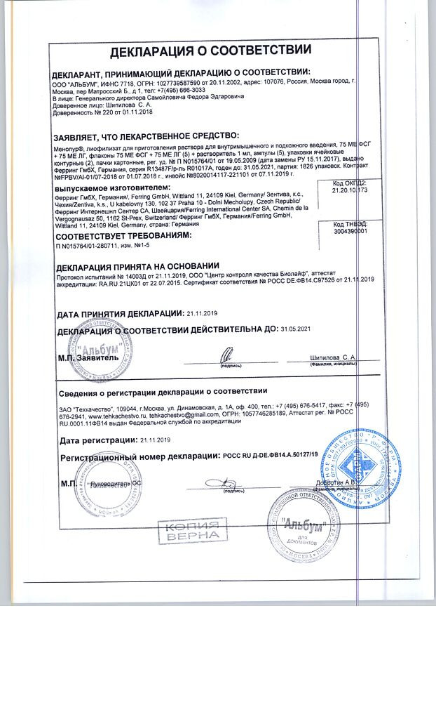 | Меногон пор. лиоф. для ин. 75МЕ №5 | Германия | 9 900 руб. | 5 флаконов с лиофилизированным порошком для инъекций |
