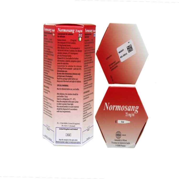 Гемин человека (Hemin) – это форма гемина, полученная из человеческого гемоглобина. Он восполняет недостаток гема при острых приступах порфирии, что приводит к снижению выработки токсичных предшественников порфиринов в печени и ослаблению симптомов заболевания.