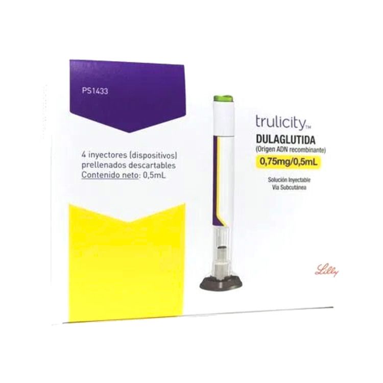 Препарат поставляется в картонной пачке, на которой указана информация о дозировке (0.75 мг/0.5 мл), торговое название «Трулисити», а также активное вещество дулаглутид (рекомбинантная ДНК). Внутри упаковки находятся 4 предзаполненные одноразовые шприц-ручки, каждая из которых содержит 0.5 мл раствора для подкожного введения. Также на упаковке указаны основные характеристики препарата и логотип компании-производителя Lilly.