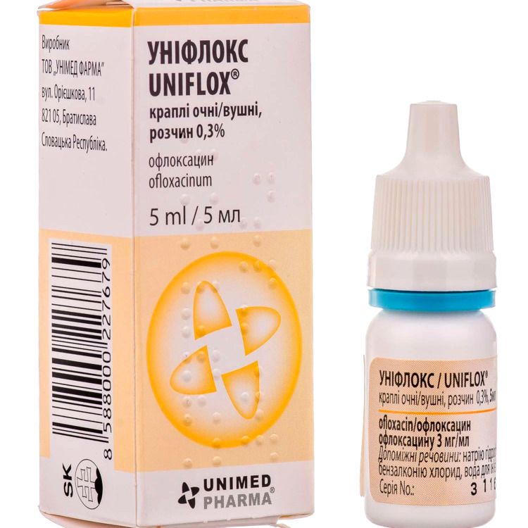 Унифлокс - раствор предназначен для введения в глаз и ухо. Он содержит активное вещество офлоксацин, которое действует на многие бактериальные инфекции глаз и ушей, вмешиваясь в процесс жизнедеятельности бактерий определенным образом и предотвращая их размножение.