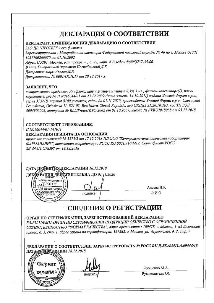 Унифлокс выпускается в форме глазных и ушных капель в концентрации 0.3%, представляя собой прозрачный, бесцветный или слегка желтоватый раствор. Препарат упакован во флаконы-капельницы объемом 5 мл.